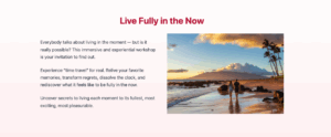 Everybody talks about living in the moment — but is it really possible? This immersive and experiential workshop is your invitation to find out. Experience “time travel” for real. Relive your favorite memories, transform regrets, dissolve the clock, and rediscover what it feels like to be fully in the now. Uncover secrets to living each moment to its fullest, most exciting, most pleasurable.